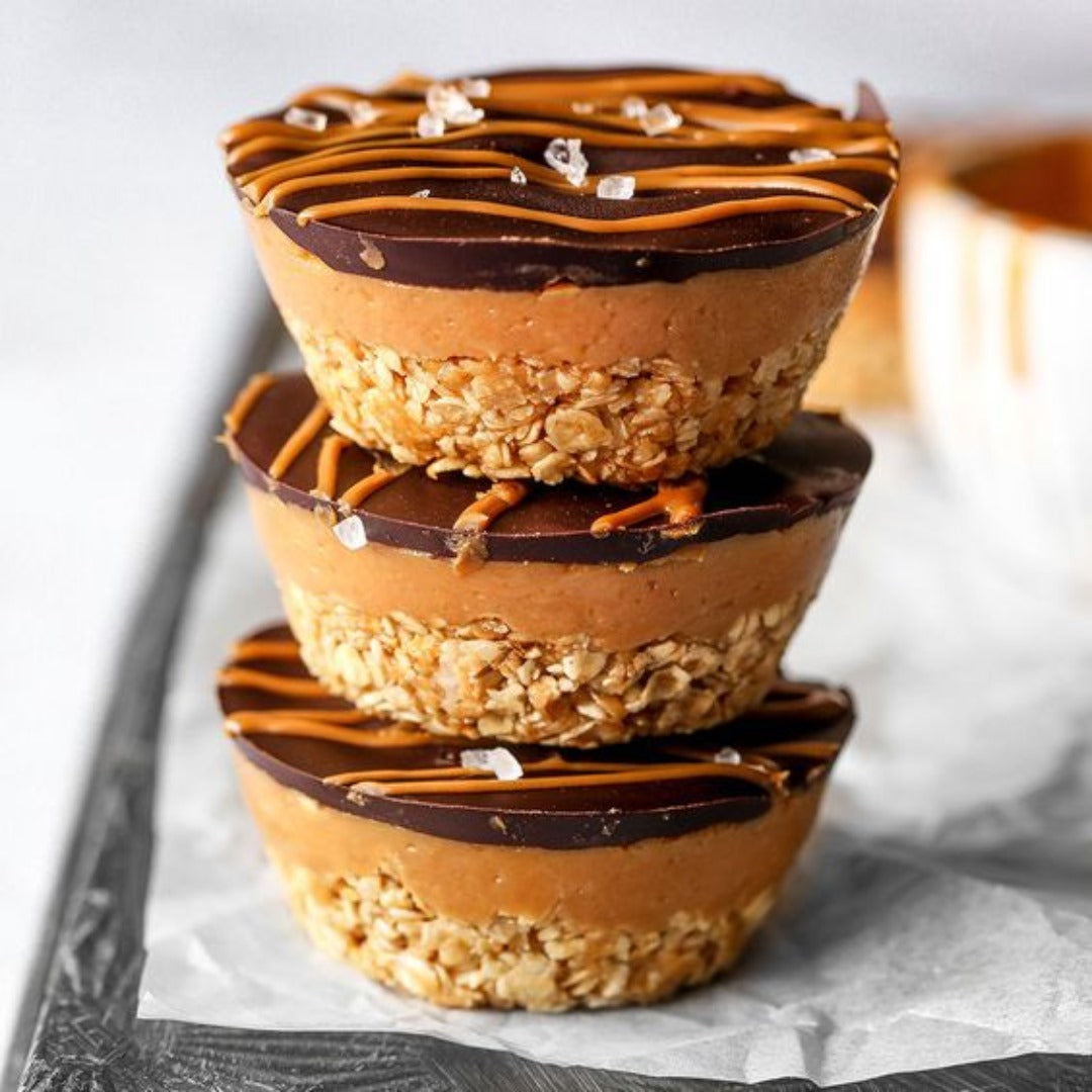 - In the meantime mix the peanut butter and maple syrup in a small bowl to create the middle layer, then spread over the oat bases and top with the melted chocolate.